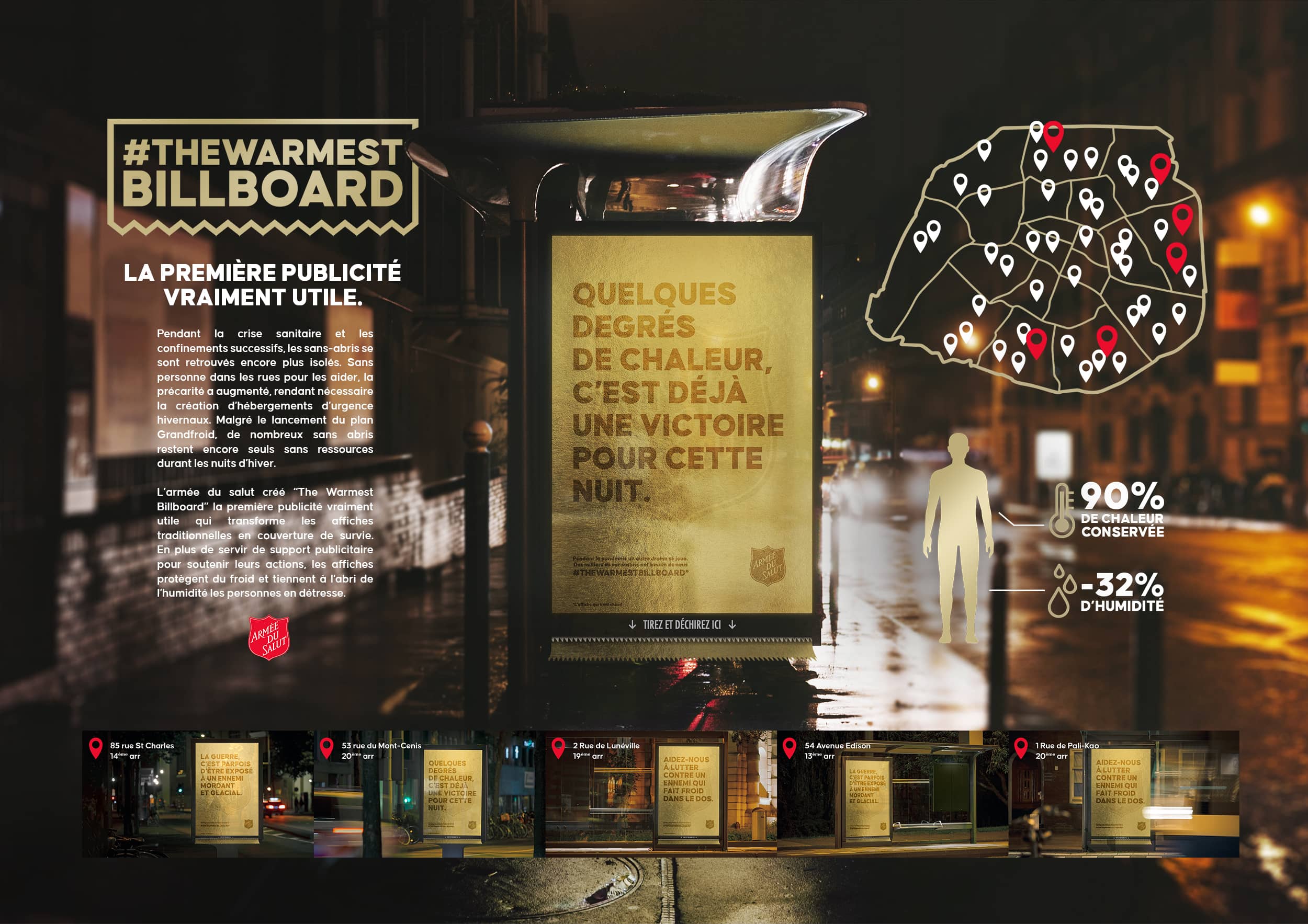 The Salvation Army created “The Warmest Billboard” the first truly useful ad that turns print ads inside traditional billboards into survival blankets. In addition to serve as an advertising medium to support their actions, the billboard protects people in distress from the cold and keep them safe from moisture.